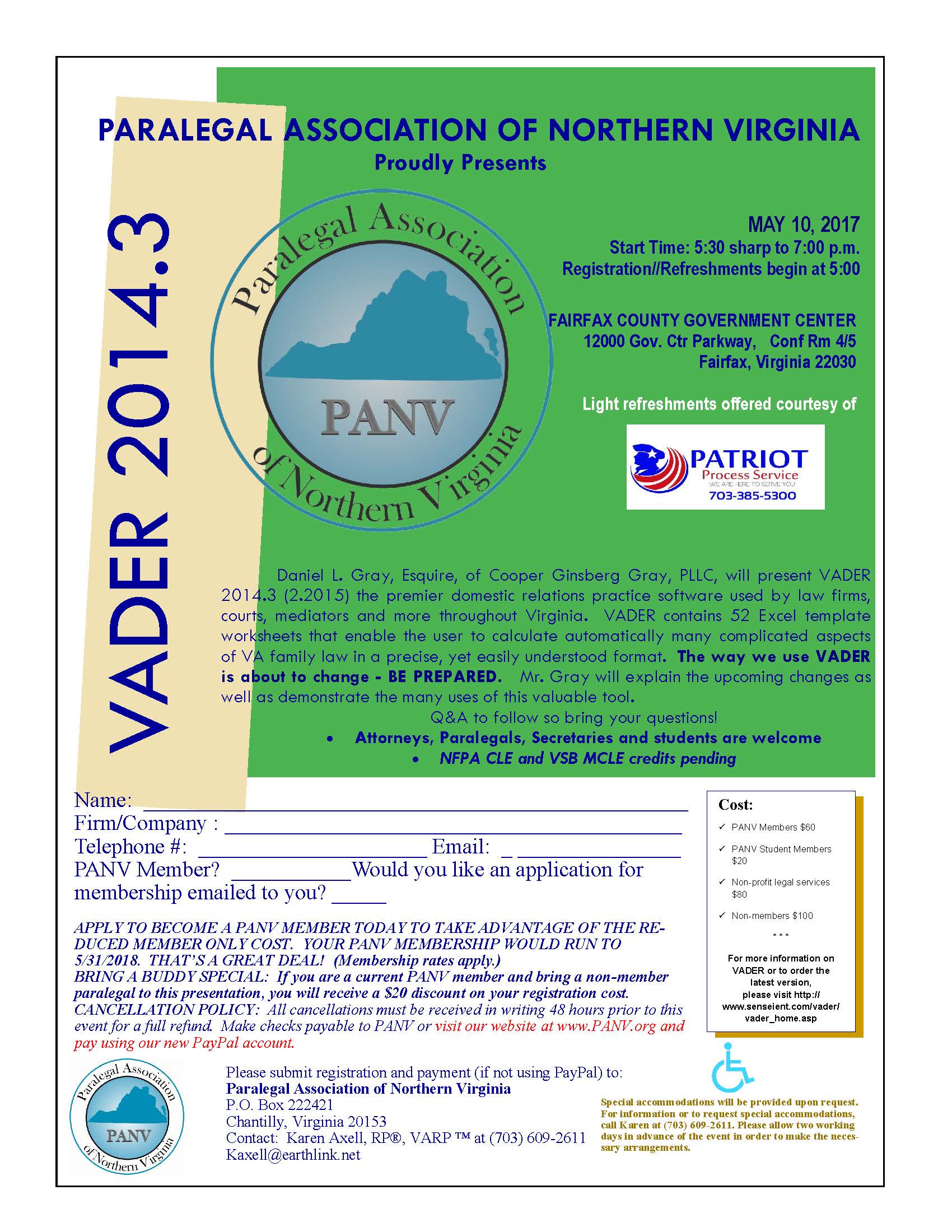 On May 22, 2012, our very own Daniel Gray will once again give his VADER presentation to the Paralegal Association of Northern Virginia (PANV). VADER is the Virginia Attorney’s Divorce Electronic Reference software used by many Virginia attorneys in child support and equitable distribution cases.