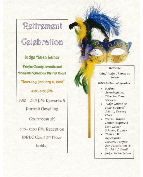 On January 11, 2018, David Ginsberg, Nathan Olson, and Rob Worster attended the retirement celebration of Fairfax County Juvenile Court Judge Helen Leiner. We all wish Judge Leiner the very best in her retirement after 11 years on the bench.